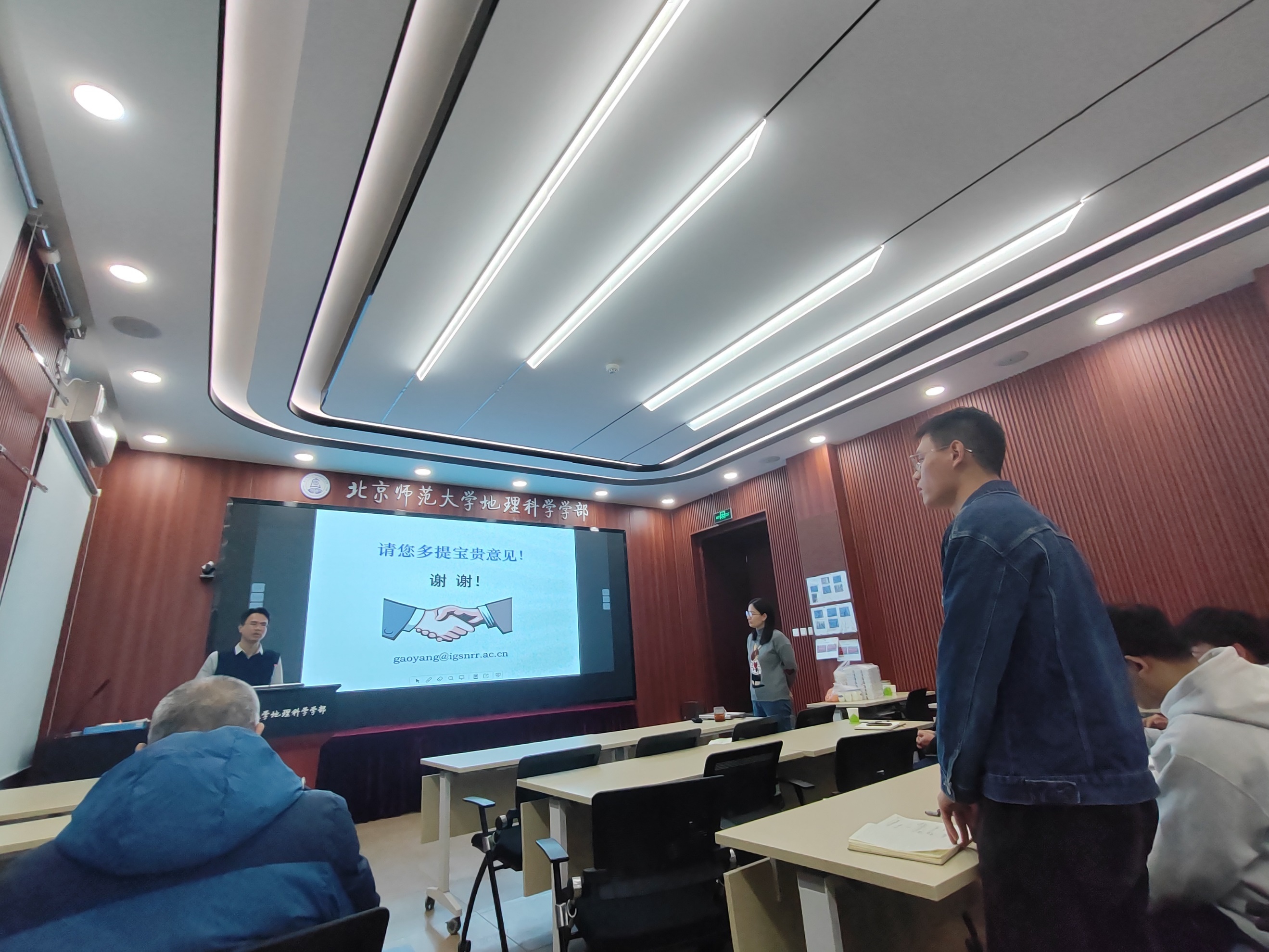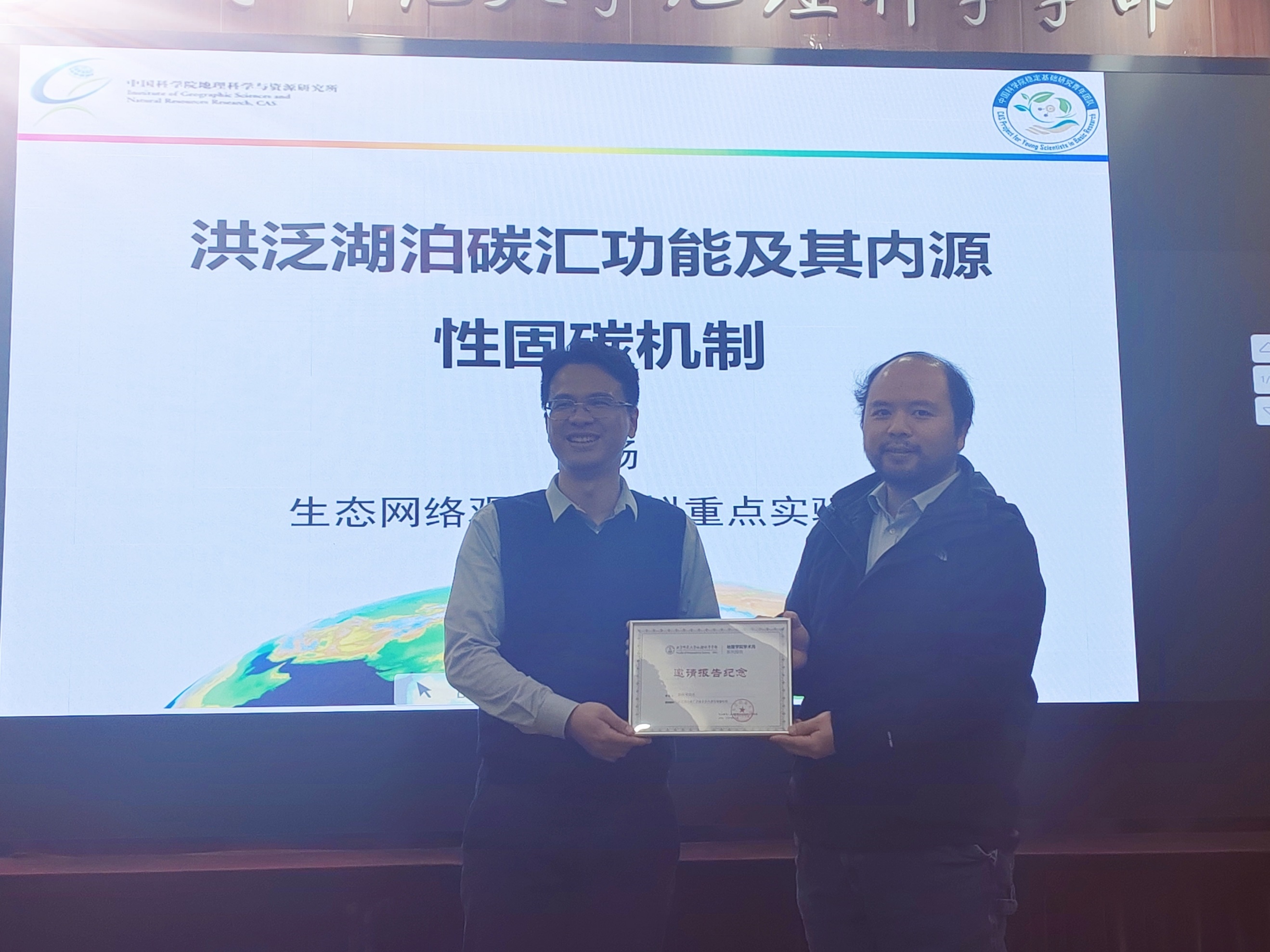 报告结束后,高扬研究员与现场师生就“土壤侵蚀是碳源还是碳汇”等诸多问题进行了热烈的交流和讨论。杨扬副教授对高扬研究院的精彩报告表达了真挚的感谢,地理学院自然地理研究所所长张卓栋副教授为高扬研究员送上了邀请报告纪念证书,并邀请与会师生共同合影留念。