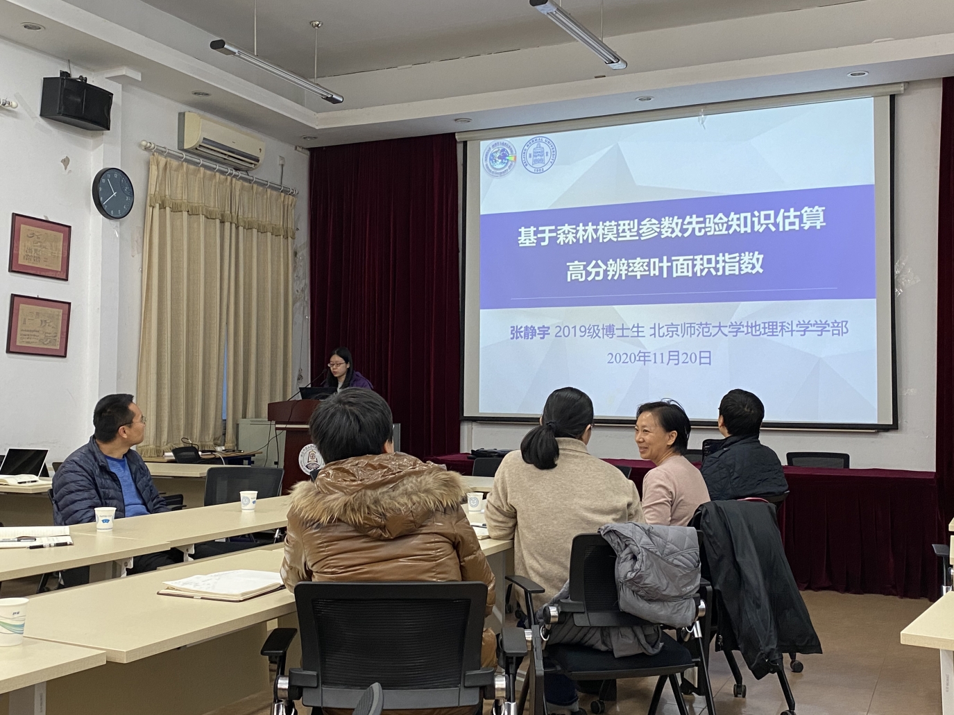 2019级博士生张静宇作了题为“基于森林模型参数先验知识估算高分辨率叶面积指数”的报告。报告针对目前高分辨率LAI估算方法的局限性提出了基于森林模型参数先验知识的估算方法,之后利用验证站点的数据,采用交叉验证的方法进行了有效性和稳定性评价。张静宇同学和在场师生针对地面观测数据时效性与精度的关系以及观测数据的分布和质量问题进行了探讨。