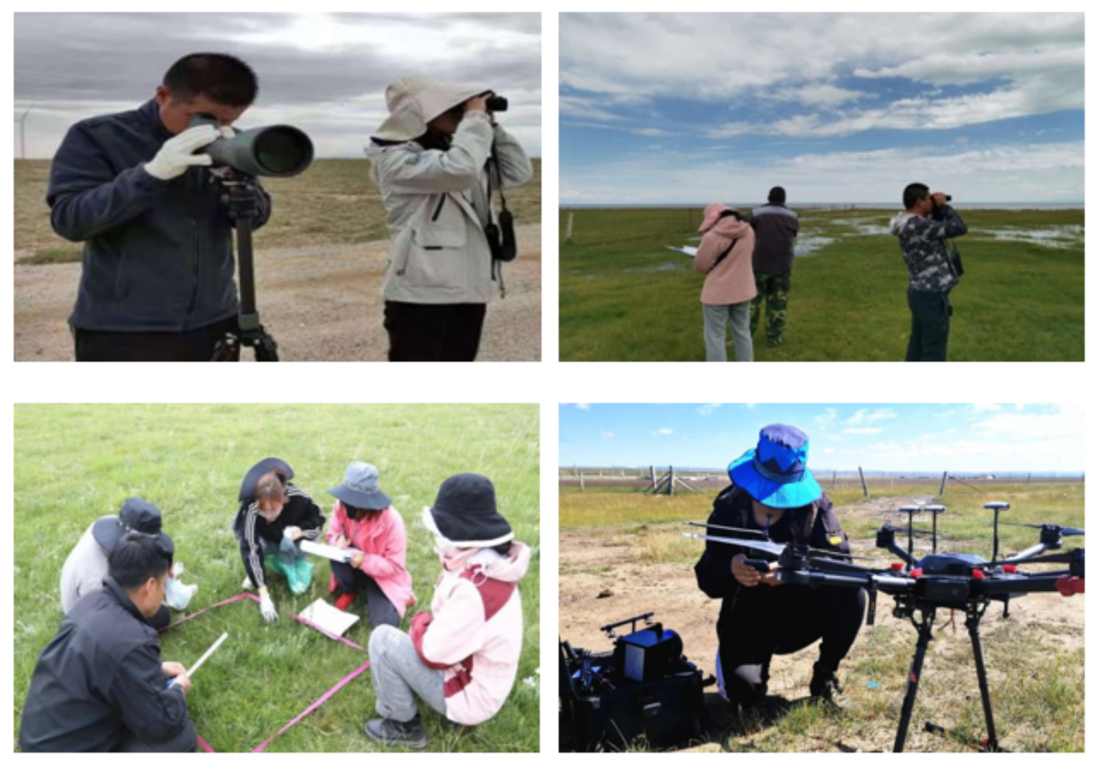 环青海湖流域生物多样性综合监测野外调查小队根据计划分为植被监测、普氏原羚监测、水鸟监测和遥感监测四个小组开展科考工作。植被监测小组在青海湖周边选择了28块1 m2的样地,基本涵盖了该地区所有植被类型。小组成员记录了植被样地的类型、生物量等数据,并调查其植被变化的各类影响因素。普氏原羚监测组成员开车、步行相结合,走固定样线、样点,利用望远镜等工具,对普氏原羚种群数量、分布、栖息地状况进行了调查,研究其生存状态和人类干扰因素。经过调查,2021年普氏原羚总数3824只,其中雄性普氏原羚932只、雌性普氏原羚2279只、幼羚613只。水鸟监测小组则在环湖区域设置了24个水鸟观测样地,分布于甘子河湿地、布哈河口等地区,对水鸟种类、种群数量等生存状况指标进行了考察。共观测到水鸟种类46种,水鸟总数40018只。遥感监测小组在布哈河口湿地、泉湾湿地等14块湿地共调查了37个样地。主要利用无人机等遥感技术,获取了青海湖湖域水域边界的变化范围以及湿地淹没区的变化情况。