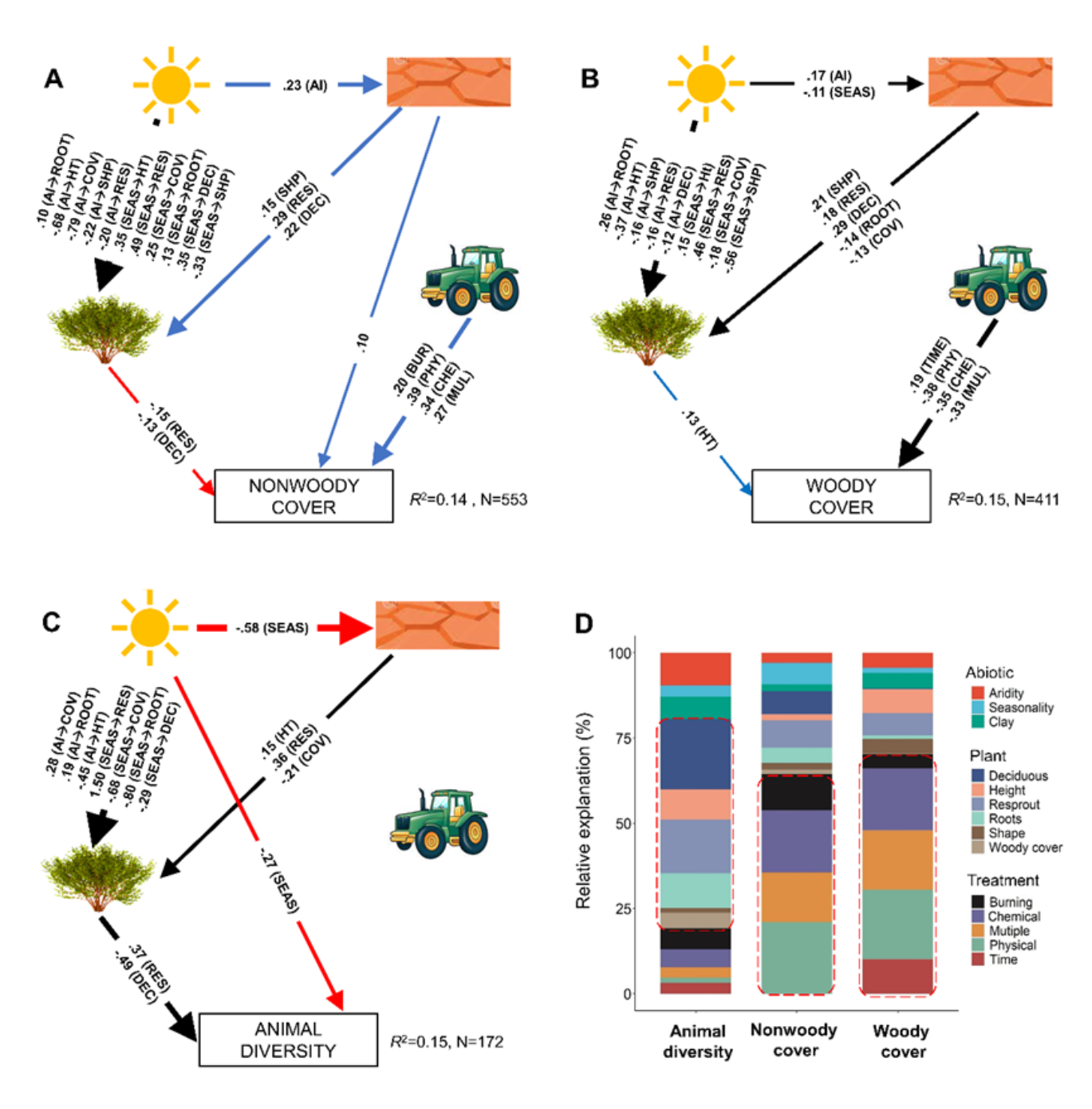 图5. 驱动因子(气候、土壤、灌丛化性质和移除管理)对灌木移除效果(A草本植物盖度,B灌木盖度,C动物多样性)的影响。其中,AI干旱度,SEAS降水变率,CLAY土壤黏粒,COV灌丛盖度,HT高度,ROOT根系类型,SHP冠层形状,RES再发芽能力,DEC落叶性,TIME灌木移除后的时间,PHY物理移除,CHE化学移除,BUR火烧移除,MUL多种移除;(D)基于每个驱动因子的标准总效应所计算的相对解释率占比。