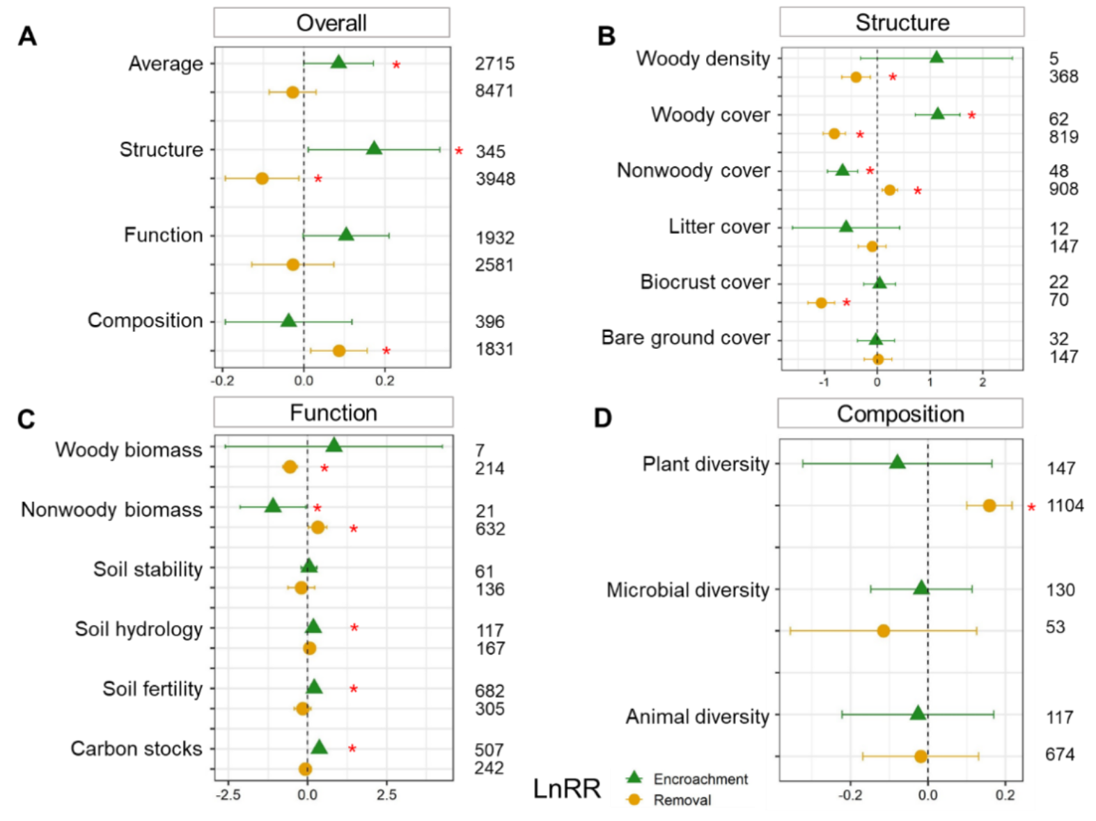 图2. 灌丛化(绿色)和灌木移除(黄色)对(A)生态系统总体,(B)生态系统结构指标,(C)生态系统功能指标,(D)生态系统组成指标的影响。研究采用LnRR ± 95%置信区间表征灌丛化[Ln(灌丛化/未灌丛化)]和灌木移除[Ln(灌木移除/未移除)]的影响,值为正则表示显著增加,值为负则表示显著减少,图中数字代表样本量。