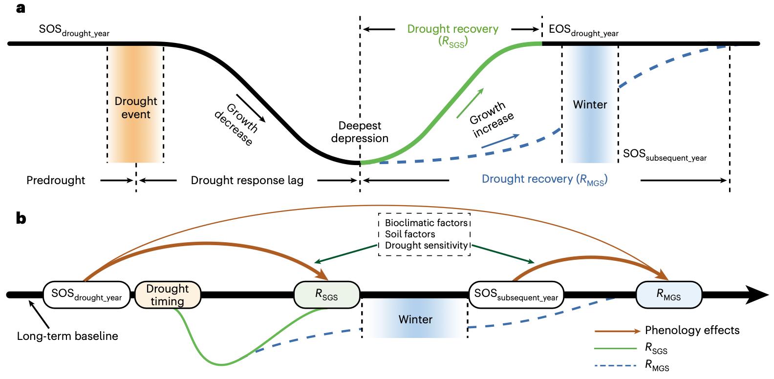 快速的气候变暖显著改变了植被物候,并导致极端干旱事件不断加剧。关于气候变化对植被物候的影响机理及不同生态系统极端干旱后恢复过程已有较深入研究。但是,植被物候变化如何影响植被干旱恢复是一个长期被忽视的关键科学问题。