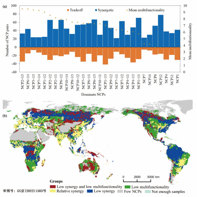 本研究构建基于指标体系的评价方法,结合生态系统演变、气候变化与人类活动在全球尺度的多源空间数据集,首次在全球范围内对1992-2018年所有18个NCPs进行空间制图,在15,204个流域单元上识别主导的NCP组合,并基于NCPs时空特征识别了全球景观变化的功能权衡关系和景观多功能性。