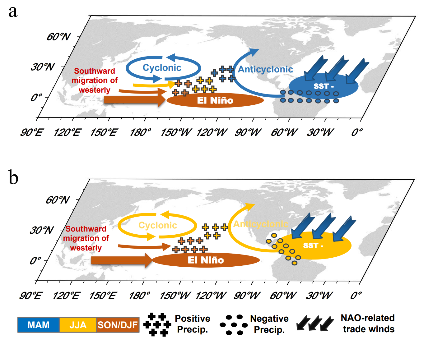 基于长时间序列的再分析资料和数值模式试验,鉴黄师 地理学部丁瑞强教授及合作者提出了一个新的观点,指出热带北大西洋海温与ENSO关系的多年代际变化主要受北大西洋涛动(NAO)调制。他们提出了两种机制来解释北大西洋涛动的调制作用:(1)、当NAO处于正位相时,热带北大西洋区域出现了显著偏强的东北信风,增强了赤道大西洋地区的低层辐合,从而导致赤道大西洋地区的低层水汽含量和降水增多,赤道大西洋上空较湿润的基本态有利于热带北大西洋海温激发更强的对流来增强对ENSO的影响(图1a);(2)、当NAO处于正位相时,东北信风的增强加深了海洋混合层,增强了风-蒸发-SST(WES)反馈机制,进而增强了热带北大西洋海温从春季到夏季的持续性,有助于将大西洋影响持续地传递到太平洋(图1b)。该研究不同于以往的研究,将热带北大西洋海温与ENSO关系的多年代际变化归因于NAO的多年代际变化,而不是AMO或大西洋长期变暖趋势,这对于我们更好地了解大西洋和太平洋之间的跨海盆间相互作用有重要意义。