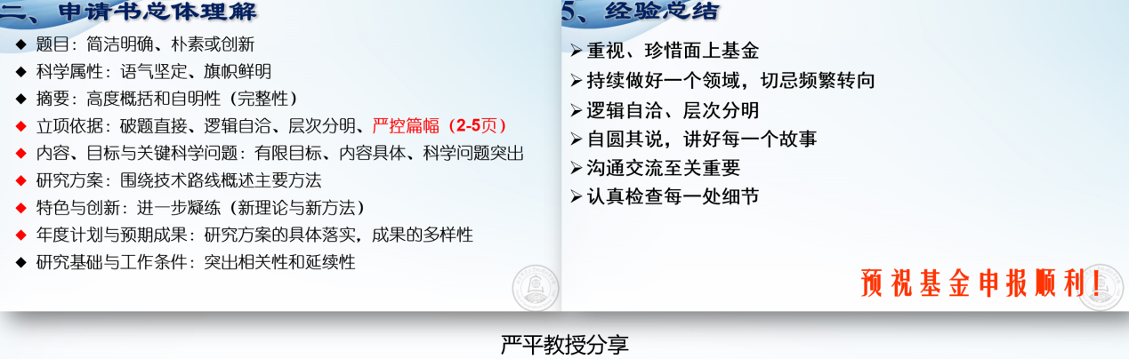 严平教授作了“国家自然科学基金面上项目申报经验交流”的报告,分享了个人25年来持续申请基金的概况,用具体案例剖析了对申请书的理解,同时分享了基金评审的一些经验和建议,最后他从重视、珍惜面上基金,持续做好一个领域、切忌频繁转向,逻辑自洽、层次分明,自圆其说、讲好每一个故事,沟通交流至关重要以及认真检查每一处细节的等方面进行了经验总结。