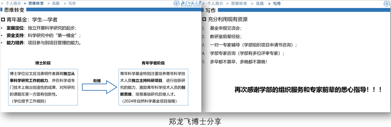 郑龙飞博士作了“国家自然科学基金青年基金申请交流”的报告,从项目背景、专业背景、思维转变、申请书选题、写作等方面详细分享了青年基金的申请经验,提出了充分利用现有资源如参加基金申报交流会、向教研室前辈取经、