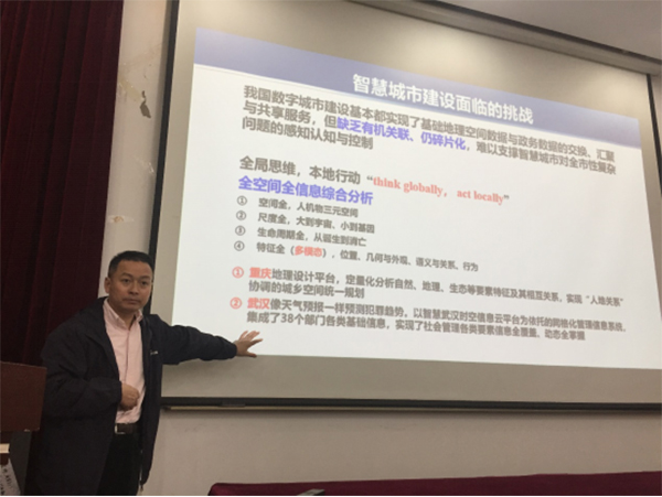 2018年4月11日上午,地理学前沿讲座第五期在生地楼180会议室举行。西南交通大学地球科学与环境工程学院朱庆教授作题为“多模态时空大数据可视分析”的学术报告,董卫华教授主持报告,报告吸引了多名师生到场学习与讨论。
