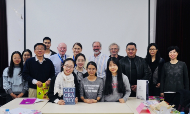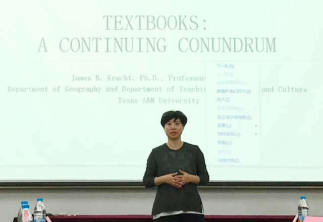 2018年10月10日晚6:30,应学部蔚东英副教授的邀请,美国德州农工大学地理系的James B. Kracht教授在地理学院作了题为“Textbooks: a continuing Conundrum”的报告,参加活动的嘉宾还有学部的王民教授、美国密苏里大学的Carole Murphy教授、William C. Kyle, Jr.教授和法国国家博物馆的Yves Girault教授。来宾们首先参观了由王民主编、蔚东英副主编的四本初中地理教科书、十本高中地理教科书以及最新编写的高中地理教科书。