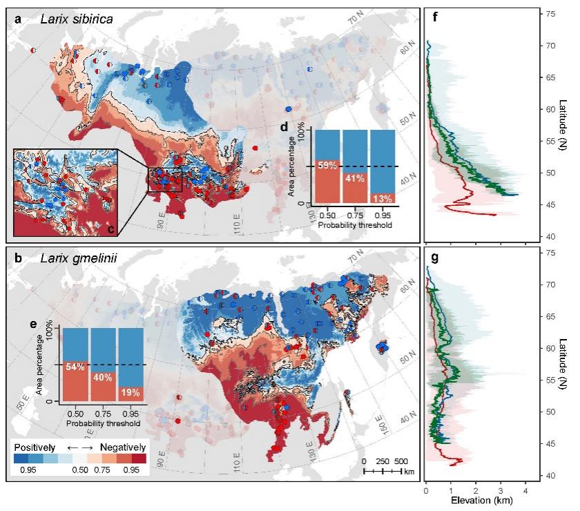 4、进一步将拟合模型应用于多情境的CMIP6气候预测数据,发现Larix sibirica和L. gmelinii生长对升温表现出负响应的分布将大幅度向高纬度和高海拔方向扩展(图4)。从生物地理学视角看,这很可能成为地球历史上“北极-高山间断分布”形成过程的当代再现。