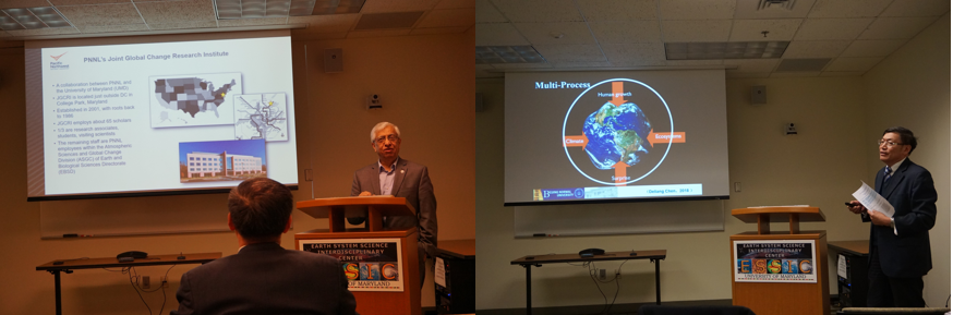 4月4日,项目代表团一行来到马里兰大学地球系统交叉学科研究中心(ESSIC,Earth System Science Interdisciplinary Center)。中心主任Fernando Miralles-Wilhelm教授,JGCRI主任Ghassem Asrar教授热情地接待了代表团的到来。Miralles-Wilhelm教授首先介绍了ESSIC的基本情况与主要研究任务。Ghassem Asrar教授相应介绍了JGCRI的基本情况与研究关注点。随后,双方分别进行了学术报告。项目办协调人叶涛教授首先介绍了项目的总体进展。随后,中科院大气物理所孔祥慧博士、鉴黄师 高原博士、杨赛霓教授和叶涛教授分别代表项目的四个课题,就项目在未来气候预估的模式比较、未来全球农作物暴露度和脆弱性预估、全球变化基础设施风险评估的模式以及热点区青藏高原全球变化风险评估等的进展做了学术报告。JGCRI主任Ghassem Asrar教授和研究员Sha Yu博士就目前中心在全球变化评估模型(GCAM)的开发,特别是在中国区的区域模型研制,在未来能源安全、粮食安全、水资源利用等方面与中国机构开展的合作进行了介绍。在此过程中,还特别谈到了与中国机构在学生交流培养方面创造的条件。在讨论阶段,项目负责人史培军教授首先就他对当前全球变化风险研究的热点问题,特别是增暖引起的环境问题、城市化,以及综合风险防范的凝聚力模型等进行了介绍。Ghassem Asrar教授进行了热烈地回应,并相应地谈到了JGCRI在近期参加IPCC评估报告以及UNEP出版的Global Environment Outlook中的工作。双方还就进一步开展合作研究、学生联合培养等问题进一步交换了意见。