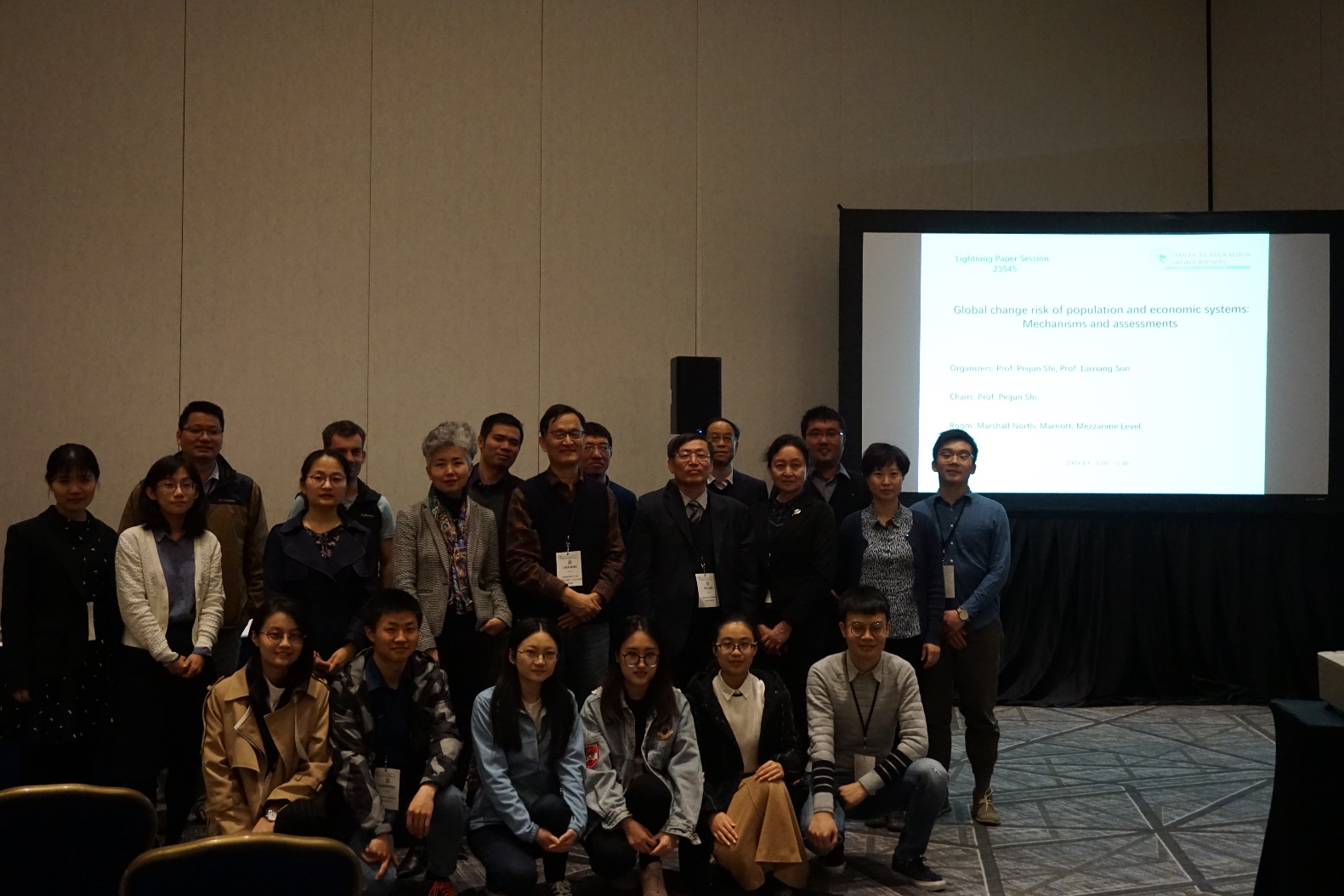 4月6日上午,由项目组织的“Global change risk of population and economic systems: Mechanisms and assessments “专题分会场在会议酒店正式举行。会上,分会场主席、项目负责人史培军教授首先对会场安排进行了介绍。项目办叶涛教授简要介绍了项目执行三年以来取得的重要进展。随后,项目组骨干中国科学院大气物理所孔祥慧博士、鉴黄师 李宁教授、杨赛霓教授、叶涛教授以及参加项目的博士硕士研究生分别做了学术报告。此次分会场还吸引到相关领域的研究人员日内瓦大学的Guillaume Rohat博士、华东师范大学的蔚丹丹同学前来参与,并分别就全球变化人口热浪风险和健康风险进行了学术报告。在总结阶段,史培军教授阐述了他关于地理协同论、地球工程、综合风险防范的凝聚力模型等新理念和新理解。分会场的最后,联合主席马里兰大学的孙来祥教授对学术报告进行了点评,并对深化项目研究提出了宝贵的意见和建议。