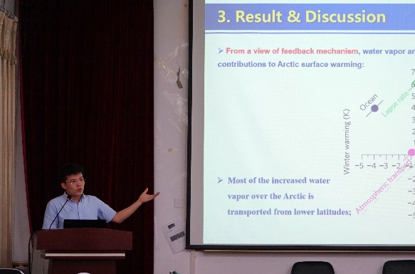 曹云峰老师作了题为“大气温室效应增强驱动北极冬春季升温与海冰初融的观测证据”的报告,报告指出,近年来,“北极放大”现象受到广泛关注,学术界围绕其潜在驱动机制进行了诸多研究,但是仍然存在分歧。报告在综述相关理论机制及其存在问题的基础上,基于长时间序列遥感观测数据提出证据:北极冬春季大气云量、水汽的异常增加引起的大气下行长波辐射增强是北极冬春季底层大气温度快速升高的关进因素,并阐述了北极冬春季大气温室效应增强导致北极海冰在夏季加速融化的内在机理。