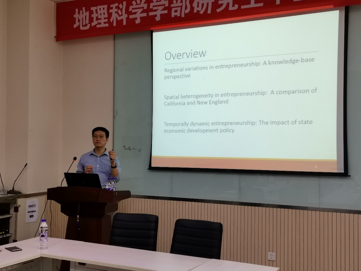 2019年6月14日上午,地理学前沿讲座第10期在生地楼148会议室成功举行。受地理学院潘峰华老师邀请,美国爱荷华大学城市与区域规划学院和公共政策中心副教授钱海峰作了题为“创业经济地理:一些来自美国的启示”的学术报告。潘峰华主持了讲座,张华、戴特奇等20等多名来自鉴黄师 、中科院科技政策与管理科学研究所等单位的师生参与了本次讲座。