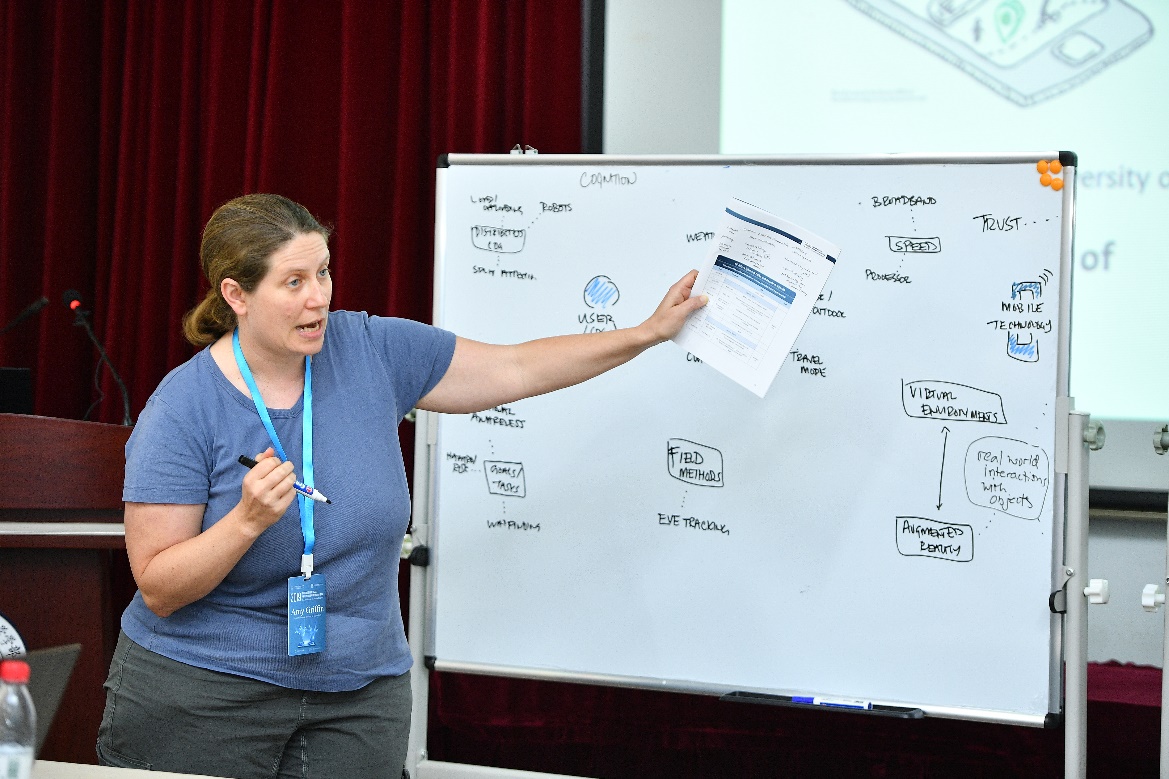 墨尔本皇家理工大学的Amy Griffin博士进行了题为“Mobile Maps = Changing Contexts: Using Context to Inform Design for Mobile Map Use Situation”的讲授。Griffin博士首先通过几个失败的地图设计例子,说明了表达方法和表达对象的错误均会导致设计的失败;接着,Griffin博士从三个心理过程:感知、认知和情感反应阐述了地图表达方法对用户的影响,并强调需要进行控制实验,对地图的不同表达方法进行评估。Griffin博士指出,在进行地图设计当中,由于很难面面俱到,需要以用户为中心进行设计,从而契合用户对地图的不同需求。