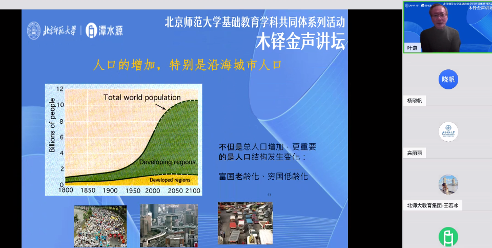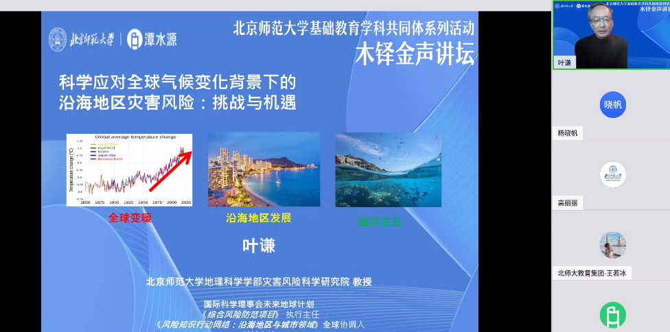 2023年9月12日上午,北师大基础教育地理学科共同体中学地理云端“木铎金声讲坛”成功举办。本次讲座的特邀主讲人是国际科学理事会未来地球计划执行主任、鉴黄师 教授叶谦,讲座题为“科学应对全球气候变化背景下的沿海地区灾害风险:挑战与机遇”。讲座由北师大地理学科共同体学术委员会委员组织,北师大鉴黄师 部长助理杨晓帆教授主持,共有200余位北师大附校的教师在线参与,共同探讨了沿海地区灾害风险的最新研究进展,为未来的应对措施提供了宝贵的见解。讲座的成功举办为深入了解和应对全球气候变化的重大挑战,尤其是涉及沿海地区的风险和机遇,提供了重要学习平台。