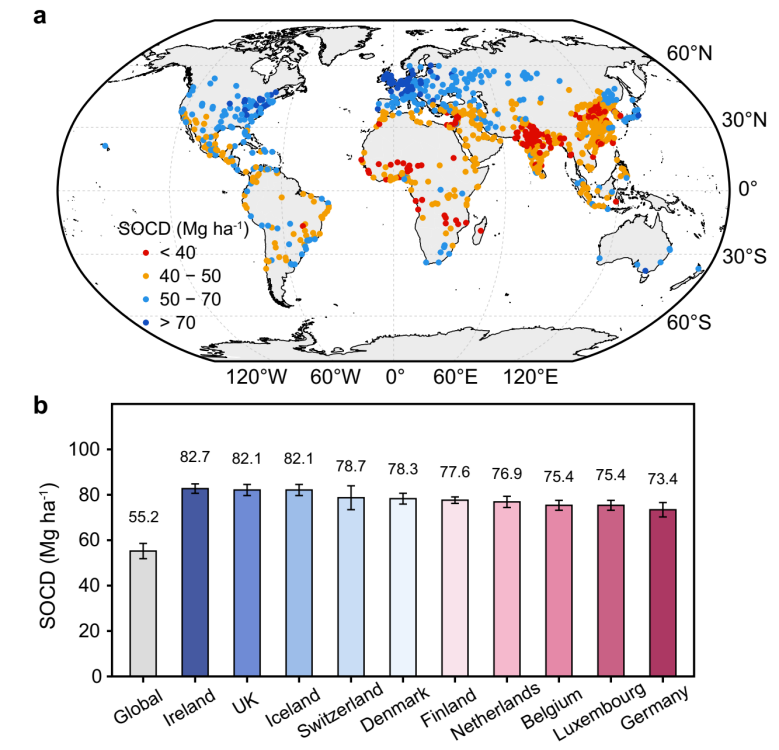 图2. 全球主要城市绿地表层土壤有机碳密度(SOCD)的空间分布(a)及国家间比较(b)