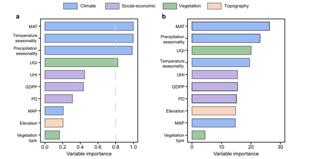 图1. 全球城市绿地表层土壤有机碳密度影响因素相对重要性(a. 基于线性模型;b.基于随机森林模型)