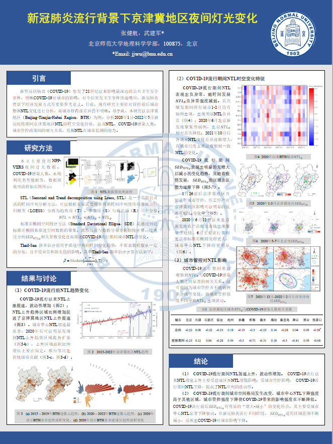 2023年6月16-18日,张健航前往成都参加了第六届全国定量遥感学术论坛并提交了海报。海报名为”新冠肺炎流行背景下京津冀地区夜间灯光变化“。
