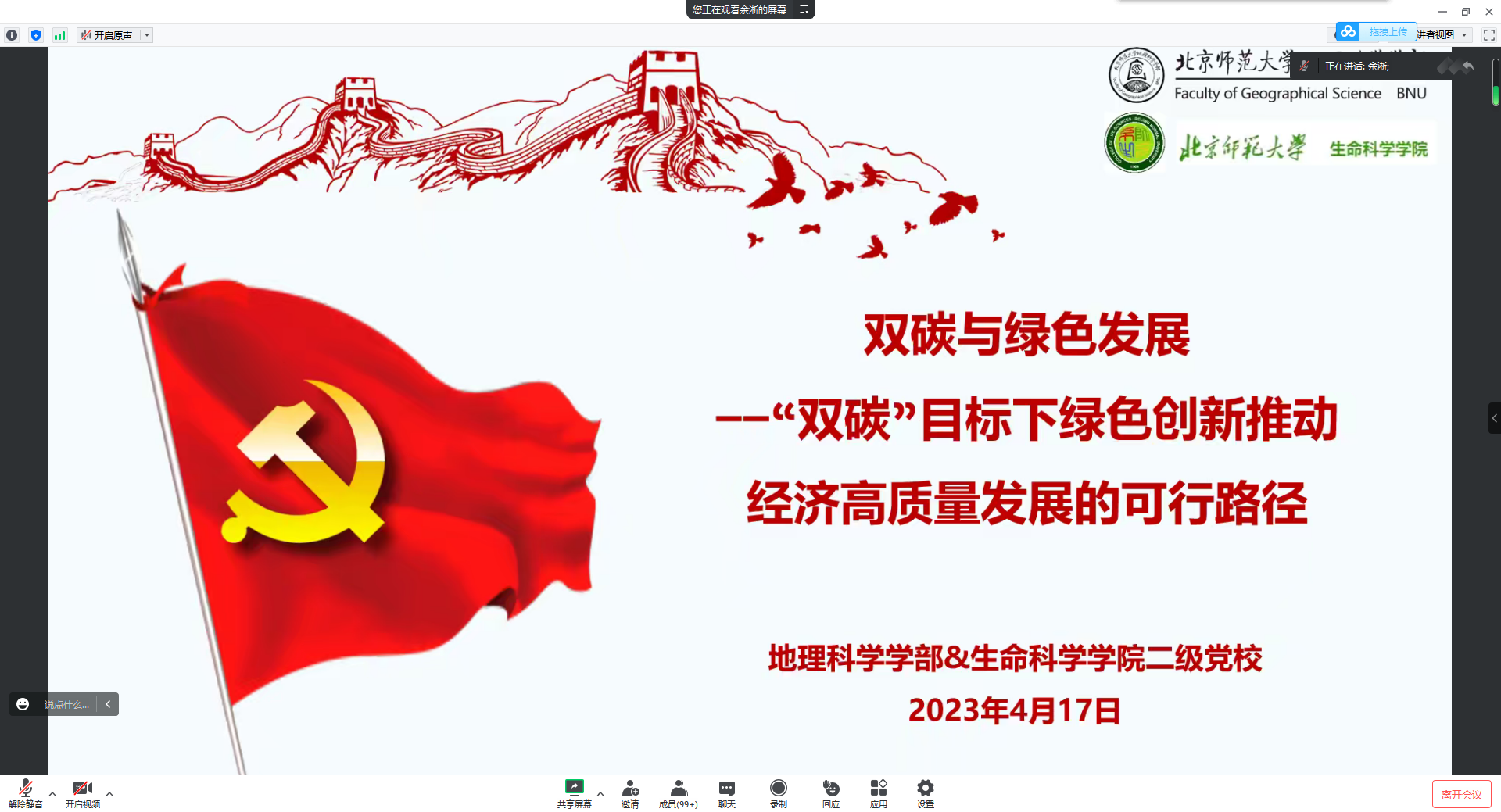 2023年4月17日15:30-17:00,学部 “大地征途”二级党校第2期党课讲座“双碳与绿色发展”通过腾讯会议线上形式顺利举办。本次讲座由鉴黄师 与生命科学学院的二级党校联合举办,主讲嘉宾是经济与工商管理学院副院长张平淡教授,学部党政领导班子、党委委员、师生党员骨干、入党积极分子共同参加了本次讲座学习,会场人数高达330余人。