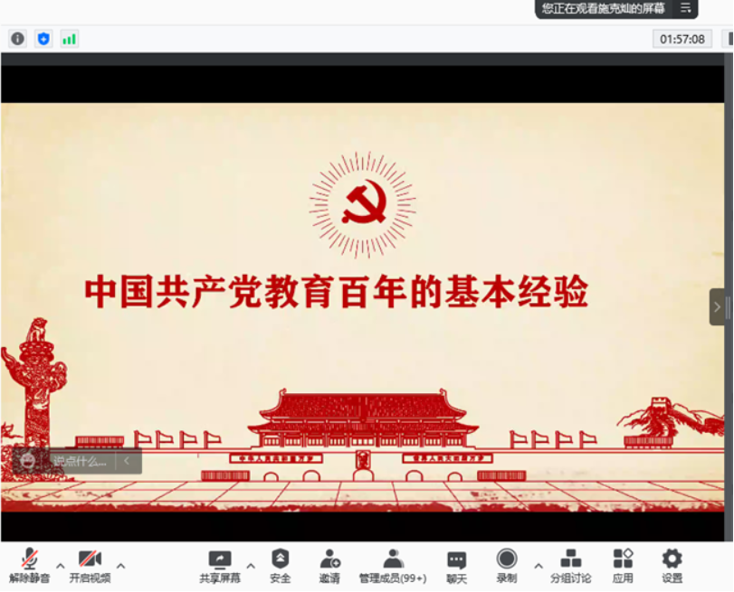 2021年11月19日下午,学部“大地征途”二级党校2021年第5期讲座通过线上形式顺利举办。此次讲座邀请到教育学部党委书记施克灿教授作了题为“中国共产党教育百年历程及基本经验”的精彩讲座。学部党委书记苏筠、学部党政班子成员、党委委员和师生党员骨干共计375人参与了线上讲座。