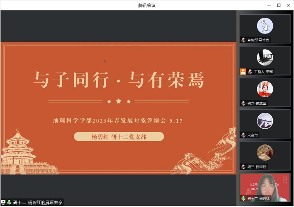 各发展对象逐一汇报了自己在政治思想、学习方面的情况,深入剖析了自己的入党动机、对党的认识和理解、自身的不足和改进措施,从学术研究到社会实践,都展示出了地理学子不断进取的风貌。评委们认真听取了每位发展对象的汇报,依据答辩情况提出针对性问题,全面考察了各位发展对象在思想、学习、生活等各方面的情况。在所有发展对象完成答辩后,党建小组成员对支部内得分、平时表现得分、现场答辩得分进行了汇总,并将排名进行了公示。