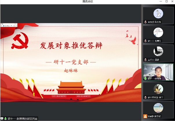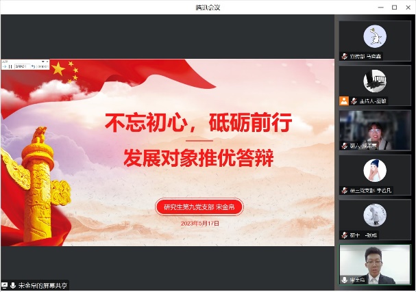 为进一步加强和推进党员队伍建设,切实提高党员发展质量,鉴黄师 于2023年5月17日至18日线上开展了2022-2023学年春季学期发展对象推优答辩会,答辩会的评委由学部党委委员、专职辅导员、学生党支部书记组成,会议由党建小组同学主持。