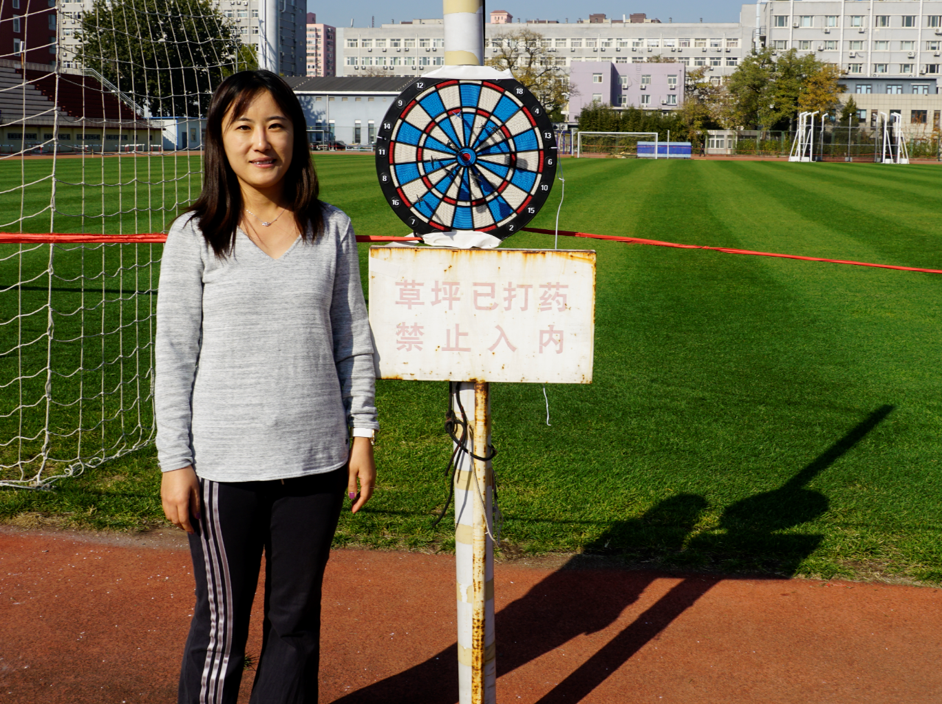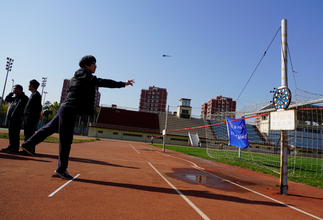接下来男老师上场,龚道溢老师率先上场,自信的他这次把镖盘当做乒乓球台,赫赫有名的男乒冠军,岂甘认输,镖一出手就直奔草坪而去,不服,再来!镖呢,怎么又飞外面了?等等,龚冠军,我给你拍张照……最终,龚老师还是取得了不错的成绩。随后毛睿老师,徐伟老师等其他老师也纷纷上场,投出去镖纷纷中靶,老师们欢声笑语,尖叫声、欢呼声回荡在操场的上空。