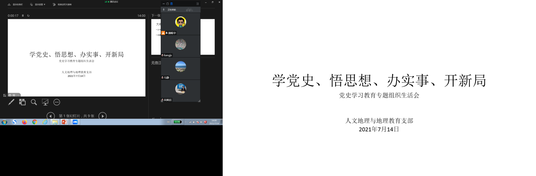 7月14日下午,人文地理与地理教育支部党史学习教育专题组织生活会在生地楼351会议室顺利召开,部分出差党员老师以线上方式参加本次会议。