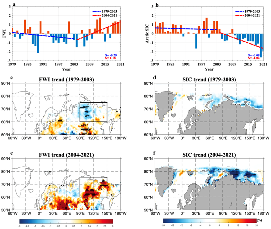 图1. 1979-2021年东西伯利亚夏季火灾天气指数(Fire weather index, FWI)和俄罗斯海冰密集度距平(Sea ice concentration, SIC)的时间变化以及FWI和SIC在1979-2003和2004-2021年的线性趋势。