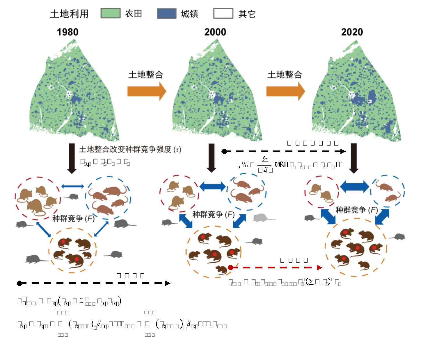 团队通过分析1980年至2022年的独特动物群落长期监测数据,将区域尺度上的土地利用变化与野生动物种群生态和生物多样性相联系,研究了人类栖息地内共生啮齿动物对土地利用变化的长期生态响应。研究发现,大规模的土地整理导致啮齿动物群落的丰度和组成发生显著变化,其中黑线姬鼠(汉坦病毒主要携带者)受益于土地整理,成为群落中的优势物种(图1)。 土地利用变化对三种常见的啮齿动物物种的影响不同,进而改变了它们之间的种间竞争结构。将土地整理指标纳入物种动态和疾病传播模型,揭示了土地整理通过抑制种内竞争和促进种间竞争,导致啮齿动物群落组成发生显著变化,啮齿动物多样性明显下降,最终增加汉坦病毒从宿主动物溢出风险。
