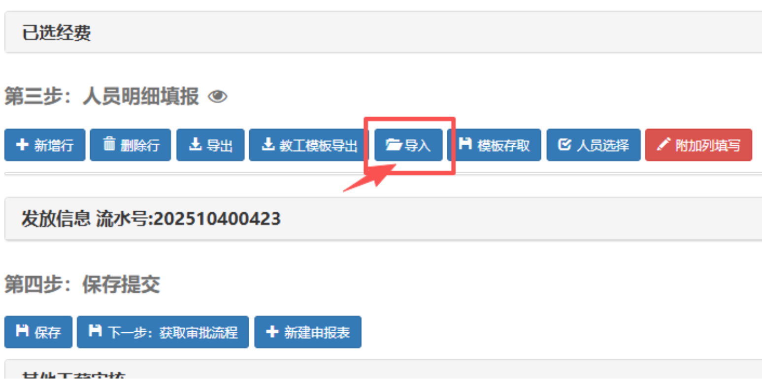 第三步:在学校财务系统中,点击到“人员明细填报”部分后,点击“导入”按钮,导入之前填写好的文件,将人员明细导入系统。(可避免老师们再次填写,减少工作量)
