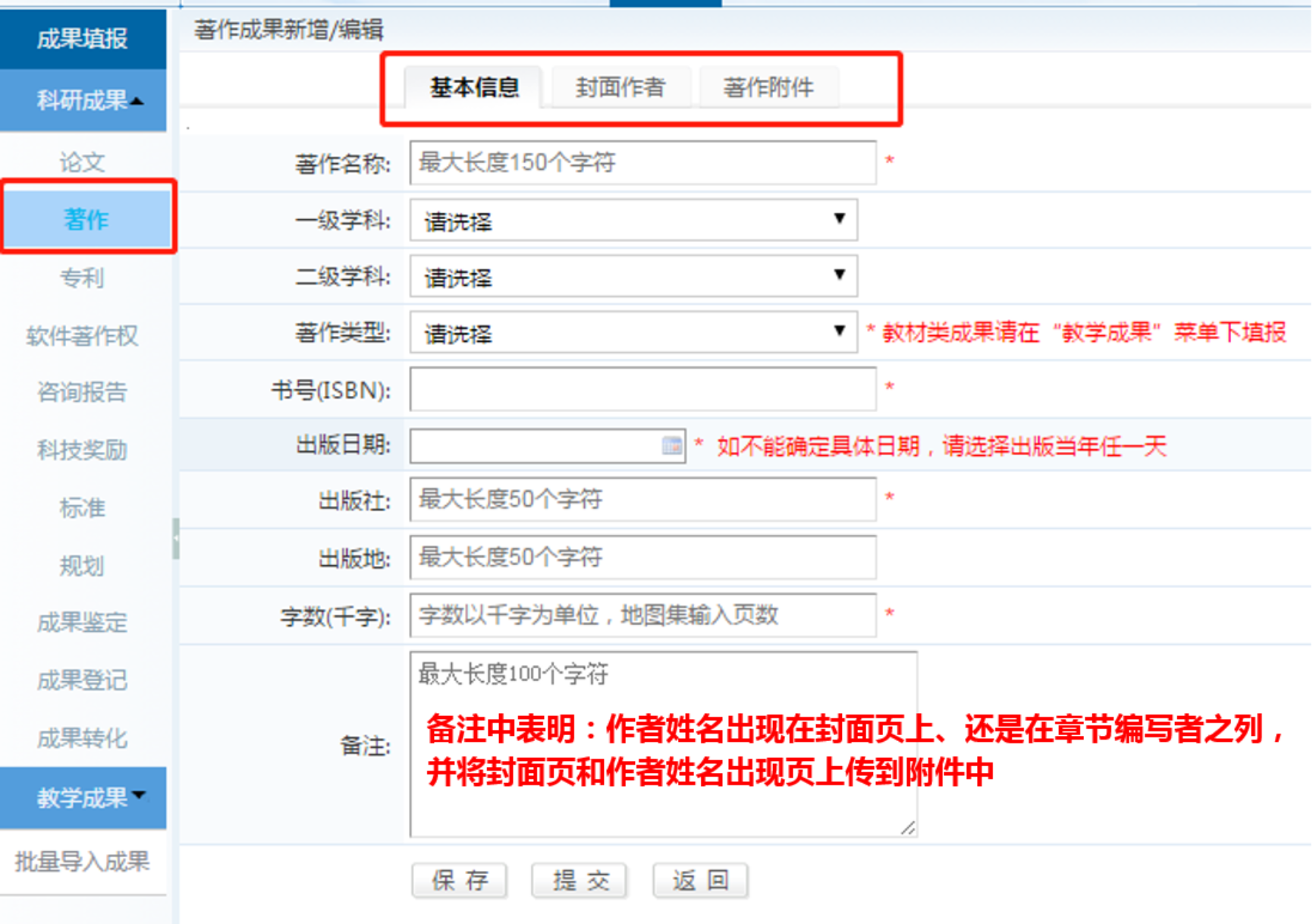 著作部分要添加基本信息、封面作者、著作附件三部分