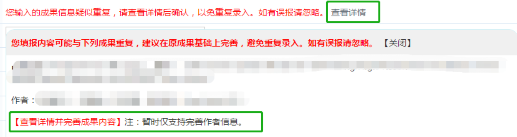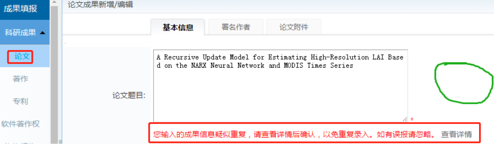 成果填报——论文——在论文题目中输入题目——点击外部任何位置(比如,下图绿色圈出位置),若出现“您输入的成果信息疑似重复,请查看详情后确认,以免重复录入”字样