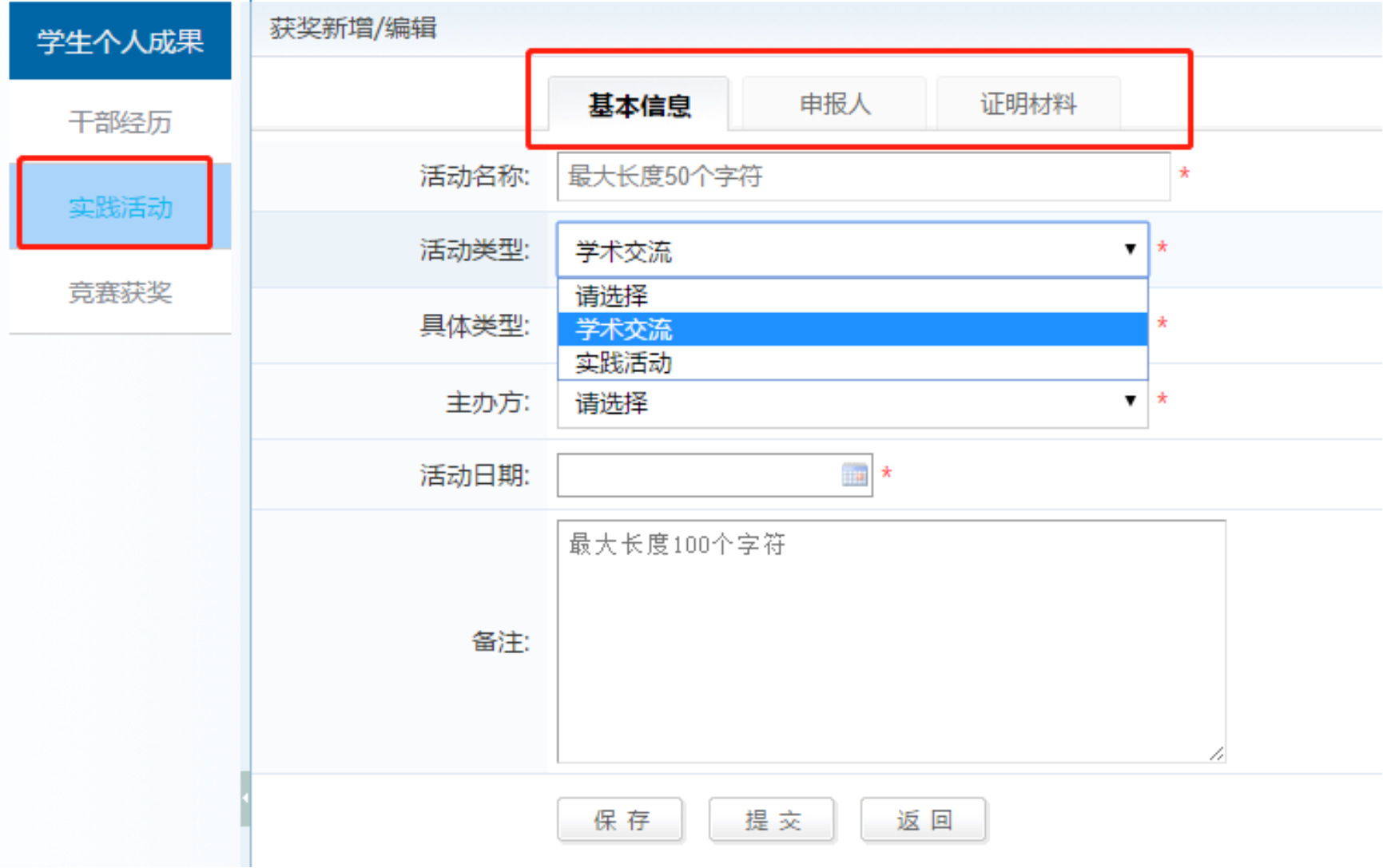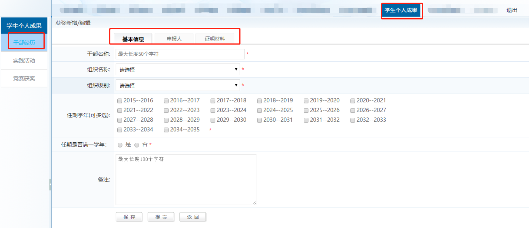 填报内容包括学术\文体竞赛类奖励、学生干部经历、学术交流与实践活动,具体要求如下: