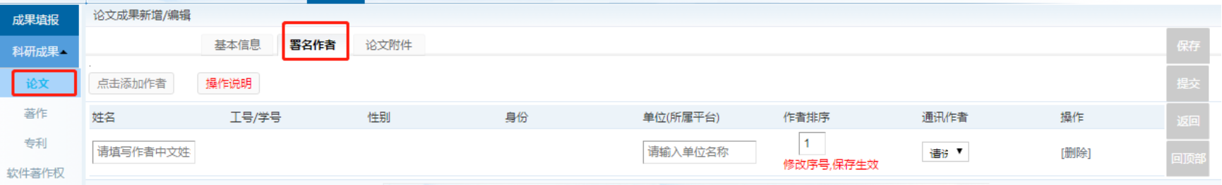 在署名作者栏目中,必须添加学部师生的信息,其他单位人员自愿填写