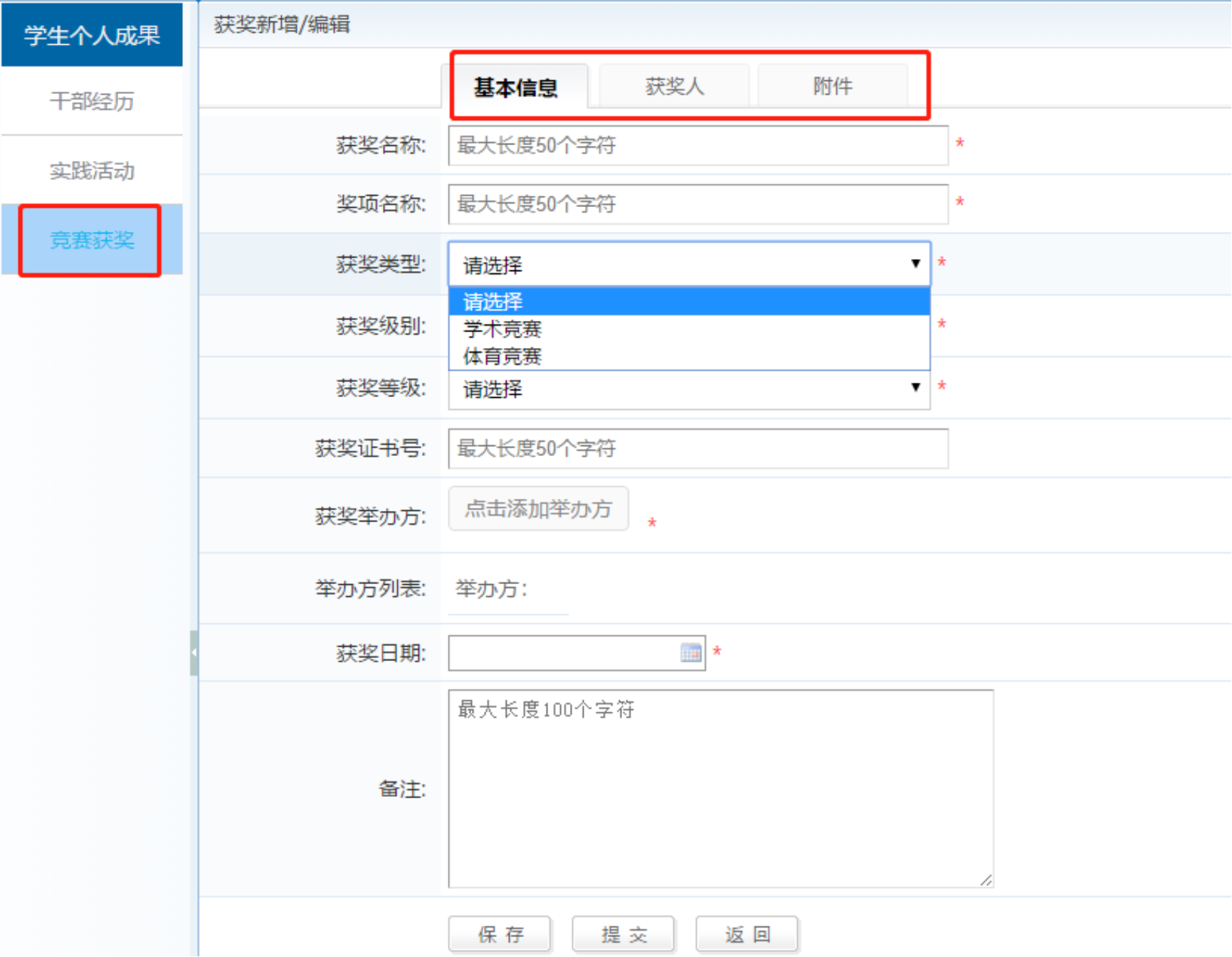 填写基本信息、获奖人、附件。