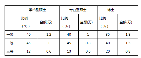 共设一等、二等、三等三个等级,博士的奖金金额分别为1.8万/人·年、1.5万/人·年和0.8万/人·年,硕士的奖金金额分别为1.2万/人·年、1万/人·年和0.6万/人·年。