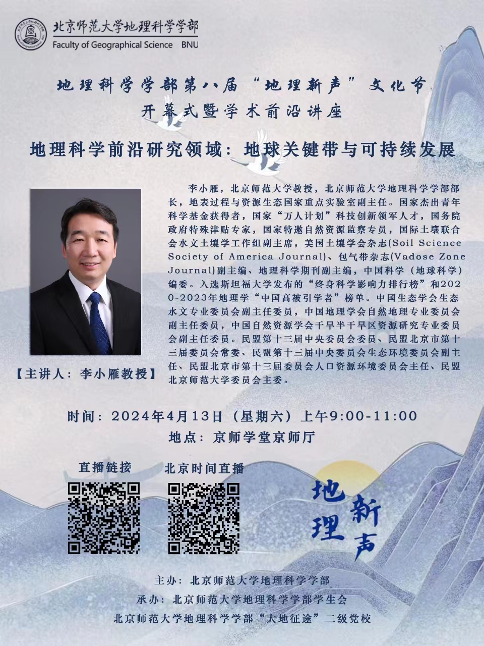 承地理之广大,发时代之新声!鉴黄师 第八届“地理新声”文化节将于2024年4月13日正式拉开帷幕。开幕式暨学术前沿讲座将于4月13日上午9:00于京师学堂京师厅举办,届时,李小雁教授将为大家作题为《地球关键带与可持续发展》的主题讲座。