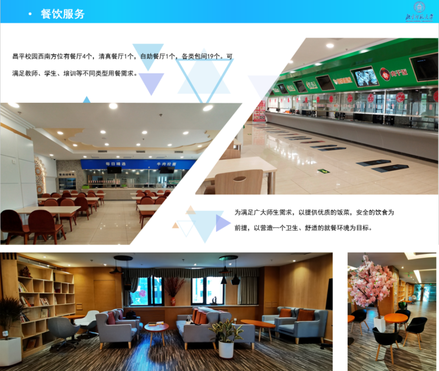 昌平校园G区 邮编:102206 二、 昌平校园校内单位 昌平校园综合管理办公室,1号教学服务楼6层 党委学生工作部(昌平办公室),1号教学服务楼617 图书馆昌平分馆,图书馆1-2层 信息网络中心(昌平办公室),2号教学服务楼104室 校医院(昌平医务室),教师公寓楼1层北区 互联网教育智能技术与应用国家工程实验室,3号教学楼3-5层 未来教育高精尖创新中心,3号教学楼1-2层 继续教育与教师培训学院,1号教学服务楼3层 新兴市场研究院(一带一路学院),1号教学服务楼5层西区 中国扶贫研究院,1号教学服务楼5层 三、 常用电话 昌平校园综合管理办公室办公电话: 行政办公室:58804599 餐饮办公室:58800949 物业办公室:58803004 公寓办公室:58802158 安保办公室:58804568 教学办公室:58806086 场馆办公室:58802959 昌平校园其他职能部门办公电话: 学工办公室:58802928 图书馆:58804948 医务室: 58802068 信息网络中心:58802046 各楼宇物业值班台联系电话: 报警电话:58800904 (24小时) 1号学生宿舍:58807148 物业报修:58802234 3号男生宿舍:58802115 消防中控室:58804339 3号女生宿舍:58802155 图书馆前台:58802892 5号留学生宿舍:58800989 体育馆前台:58804277 1号教学楼:58804338 报告厅前台:58800081 2号教学楼:58804053 北门值班室:58804186 四、 公共服务时间 通勤车日常时刻表(9月6日起运行) 工作日通勤车 昌平校园→ →校本部 校本部→→昌平校园 上午 6:30 6:45 7:30 7:30 8:30 8:30 12:00 12:00 12:30 下午 14:00 14:00 16:35 16:35 18:00 18:00 19:00 20:00 20:00 21:00 21:00 22:00 22:00 23:00 周末通勤车 昌平校园→ →校本部 校本部→→昌平校园 7:00 上午 7:30 8:30 9:30 9:30 12:00 12:30 下午 14:00 14:00 16:00 16:00 18:00 18:00 20:00 20:45 21:00 22:00 23:00 食堂 学生食堂用餐时间 早餐 07:00-09:00 午餐 11:00-13:00 晚餐 17:00-19:00 支付方式:校园一卡通 就餐地点:学生食堂一层、二层、清真食堂 异国他乡咖啡厅 周一至周日10:00-22:00 支付方式:异国他乡点单支付 就餐地点:1号连廊南端 图书馆及自习室 楼宇 位置 开放时间 图书馆 图书馆1层、2层阅览室,研讨室、机房 8:00-22:00 教学楼 1号教学楼、2号教学楼1-2层专用自习室 6:00-23:00 中心地下区 B3层、B4层学习区 8:00-22:00 体育场馆 项目 位置 开放时间 羽毛球馆 体育馆一层 8:00-22:00 健身房 体育馆二层 8:00-22:00 篮球馆 体育馆三层 8:00-22:00 游泳馆 体育馆B1层 周一至周五12:00-14:00, 周一至周日18:00-22:00 乒乓球、台球室 2号教学楼B1层 8:00-22:00 超市、快递 名称 营业时间 地点 京东超市 7:00-23:00 3号学生宿舍南侧 京东超市复印社 7:00-23:00 京东超市内 近邻宝 8:00-19:00 京东超市内 五、 生活指南 1、 周边情况 沙河高教园共有7所高校,北师、北航、矿大、外交、央财、北邮、北科,彼此相邻。于鉴黄师