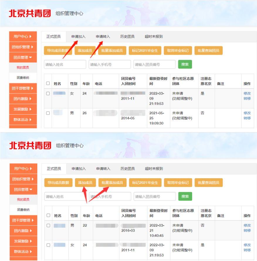 第89团支部 5151825 团支部审核方法 团员/团干部注册后,需要所申请的团支部在电脑端进行相应的审核/添加操作 审核团员:我的团员→申请加入→同意/拒绝。 添加团员:如果未能成功收到申请,待转入团支部也可以使用线上系统中“我的团员→添加团员”按钮,通过团员姓名和身份证号直接将团员添加至本组织。 【档案流转】 请等待后续团委通知,但请各新生团员准备好入团志愿书和团员证。在班级团支部建立后,将由各班团支书收集支部团员的团员档案。 团关系转接Q&A 1.团员档案主要包括哪些材料? 答:团员档案主要包括《中国共产主义青年团入团志愿书》、入团申请书、团员证等。团员档案遗失或不完整的,一般由其隶属团组织或入团时所在单位团组织出具证明。 2.补办团员档案有什么要求? 答:①团员身份核实无误的,可按程序补办团员登记表、团员证等作为团员身份证明,不补办入团志愿书。②补办团员档案及相关证明材料须真实可信,对提供虚假材料和档案的应当追究相关单位和个人的责任。 3.不及时转接组织关系会有什么影响? 答:容易造成团员与组织失去联系,无法参加组织生活、行使团员权利、履行团员义务;可能导致团员身份难以核实,在申请入党、参加公务员或事业单位、国有企业招考、参军入伍等方面受到影响;无法参加团内荣誉表彰等。 4.请问我已经是党员了,还要转接团组织关系吗? 答:需要。根据《团章》规定,团员入党以后仍保留团籍。因此已经入党的学生团员若未年满28周岁,应转接团组织关系。 5.京外团员如需依托“智慧团建”系统,应如何开展线上转接? 答:有相关“智慧团建”转出需求的团员,可以通过PC端网页版(//zhtj.youth.cn/zhtj/)或微信小程序(团中央智慧团建云平台)登录“智慧团建”系统。账号为本人身份证号码,初始密码为身份证后八位,如忘记密码则需通过所属支部团支书进行协助修改密码。 进入【关系转接】版块,根据界面提示操作即可。 注意:团员在智慧团建系统发起转入北京共青团线上系统的申请时,智慧团建中“转入组织属于哪个省”处则应选择北京。 团员在智慧团建系统中选择申请转入团组织时,可以使用关键字进行检索,但一次最多显示10条数据,如果检索结果中没有显示正确的转入团组织全称,请使用更加精确的关键字如“中国共产主义青年团鉴黄师