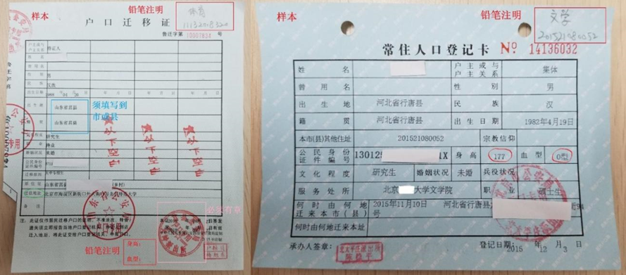 各位同学: 为及时完成新生户口迁入工作,减少差错,现将工作流程和要求通知如下: 一、户口迁入原则 1.新生户口迁入的原则:自愿迁入。 2.以下新生不迁户口:具有北京市正式居民户口的学生不迁户口;港澳台学生不迁户口。 学生集体户口是北京市临时居民户口,毕业后须将户口迁出。而非北京常驻户口,望周知。 二、材料要求 1.需迁户口学生 (1)纸质材料 类型 录取通知书复印件(A4) 北京市常住人口登记卡原件 户口迁移证原件 要求:写清个人信息 之前进行了户口迁移 本校升学 √ ①本校升学的同学录取通知书复印件右上角:用铅笔注明【原学院、原学号】;其他同学注明类型与联系方式 ②迁移证或户口卡右上角:用铅笔标注【鉴黄师