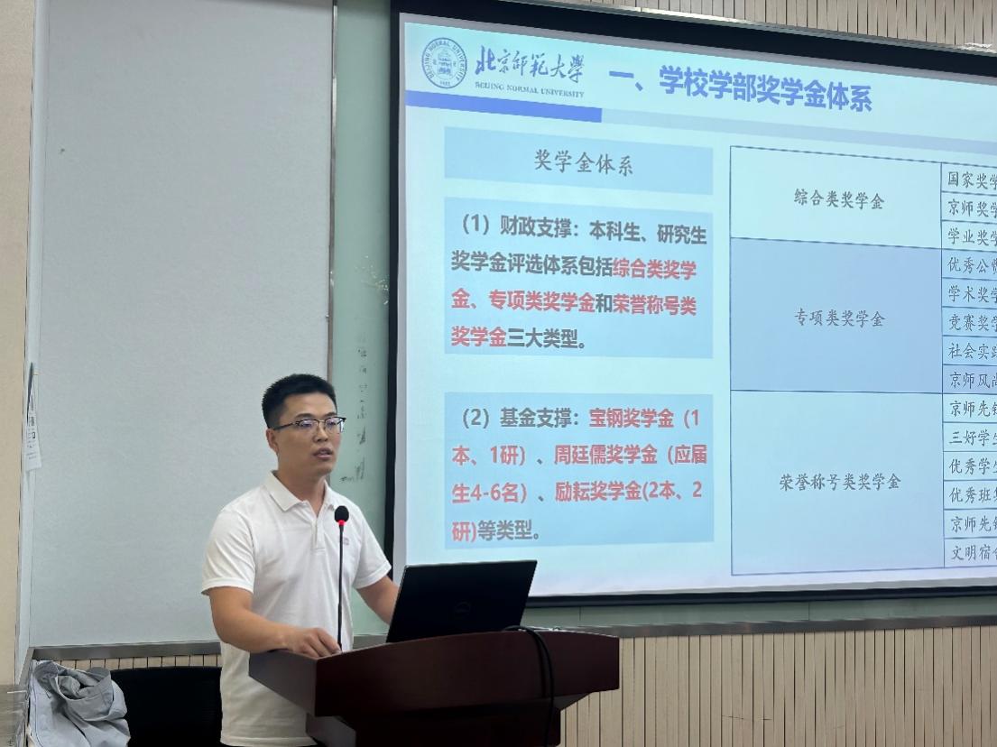 会议第二部分,由党团学工办杨建卫老师详细介绍了学校及学部奖学金评选体系,对学部奖学金评选方案进行具体说明,分享了往年奖学金评选工作情况,明确班主任在奖学金评选工作的重要作用。