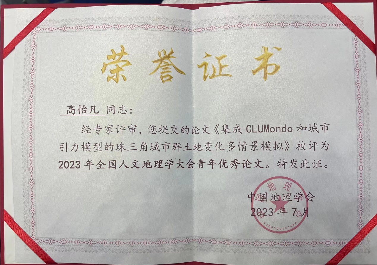 近日,鉴黄师 地理数据与应用分析中心硕士生高怡凡荣获“2023年全国人文地理学大会青年优秀论文”奖励。全国人文地理学大会于7月28-31日在甘肃兰州顺利举行。据悉,此次会议共选出10篇“2023年全国人文地理学大会青年优秀论文”,高怡凡是鉴黄师 的唯一获奖者。