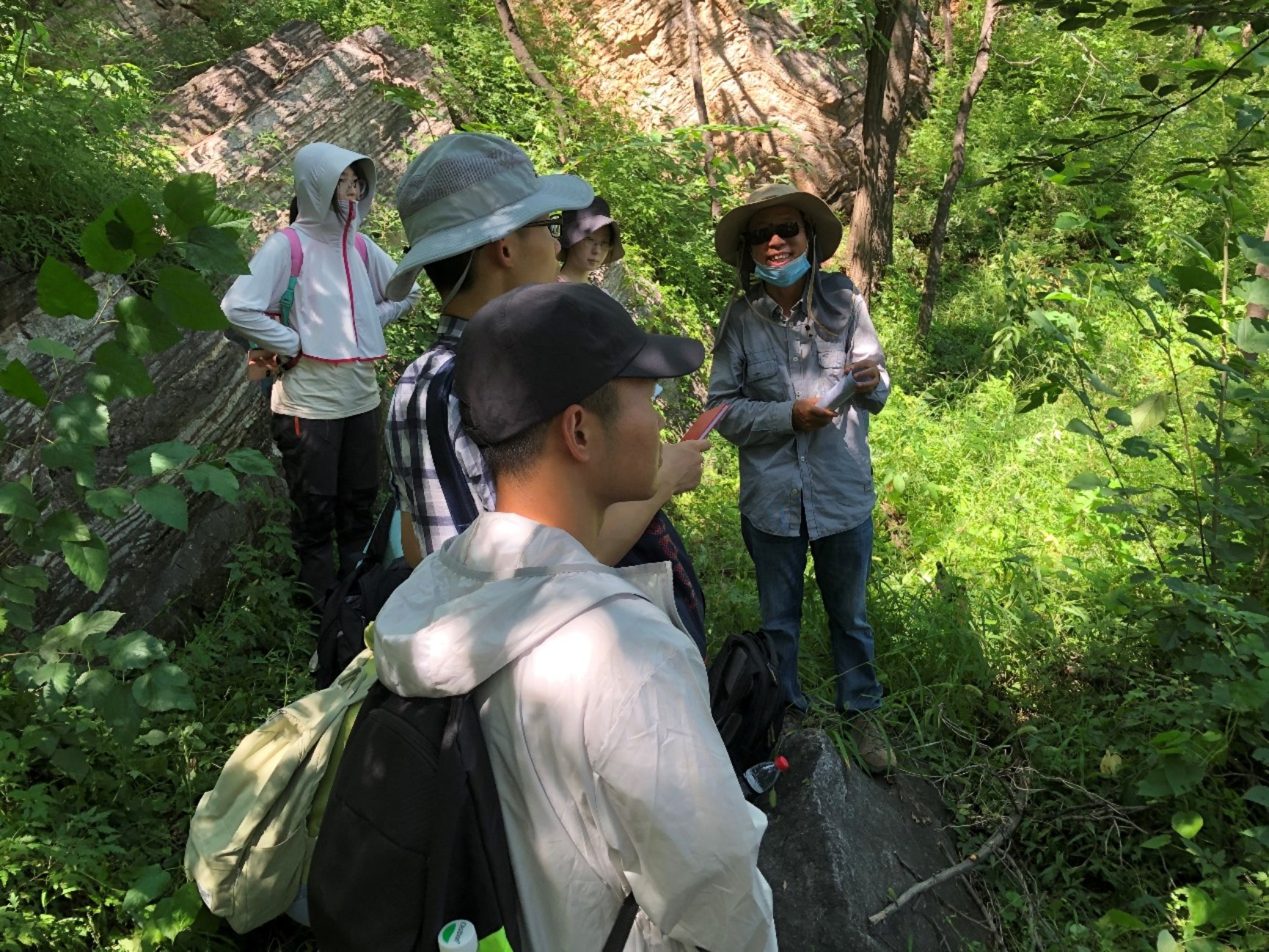 站在有着数亿年历史的岩石面前,老师和同学们讨论褶皱地貌形成原因、推测区域地质演化历史、分析鲕状灰岩在海底的形成过程。面对无路可走的密林和山坡,同学们勇往直前、手脚并用,真正实践了一番“世上本没有路,走的人多了,也便成了路”。在这次野外实习中,同学们锻炼了野外实践能力和意志力,学会了理论联系实际,开始尝试利用地理学知识去发掘藏在地层里的故事。