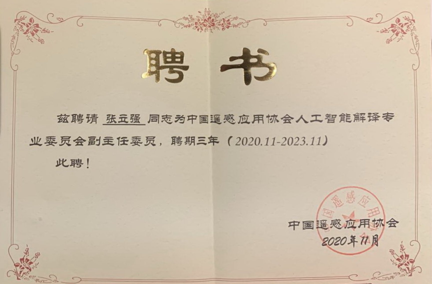 为团结国内优势技术队伍与产业力量,推动我国遥感数据智能解译技术创新、应用推广与产业化,为我国的遥感事业和空间信息产业发展提供有力支撑,中国遥感应用协会于2020年11月13日召开了人工智能遥感解译专业委员会首次会议。在这次会议上,张立强教授被聘为副主任委员(2020.11-2023.11),并在14日举行的“人工智能+空间信息”产业发展高峰论坛上,做了“遥感大数据分析与应用” 的主旨报告。