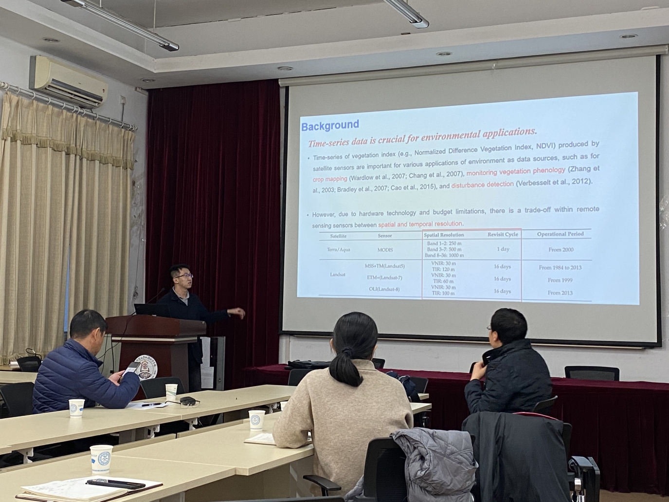 孙亮研究员作了题为“多源遥感数据融合在农业检测上的应用”的报告。报告根据“农作物种植单元为块状要求数据空间分辨率高”和“生长季短要求数据时间分辨率高”这两个问题讨论了目前农业遥感监测利用多源信息融合的必要性,针对多雨多云和空间分辨率不足的问题,从重建地表温度的角度提出了对应的解决办法,最后,孙亮研究员针对目前时空融合算法的局限性讨论了新的高时空分辨率植被指数重建算法,该算法可以克服地面种植复杂时小地块反演效果差的问题,与目前时空融合算法相比,在精度和稳定性上都具有很大的优势。报告结束后,在场师生针对方法中的曲线匹配问题、模型在多云雨地区的应用、推广的普适性等多种问题与孙亮研究员开展了热烈的讨论。