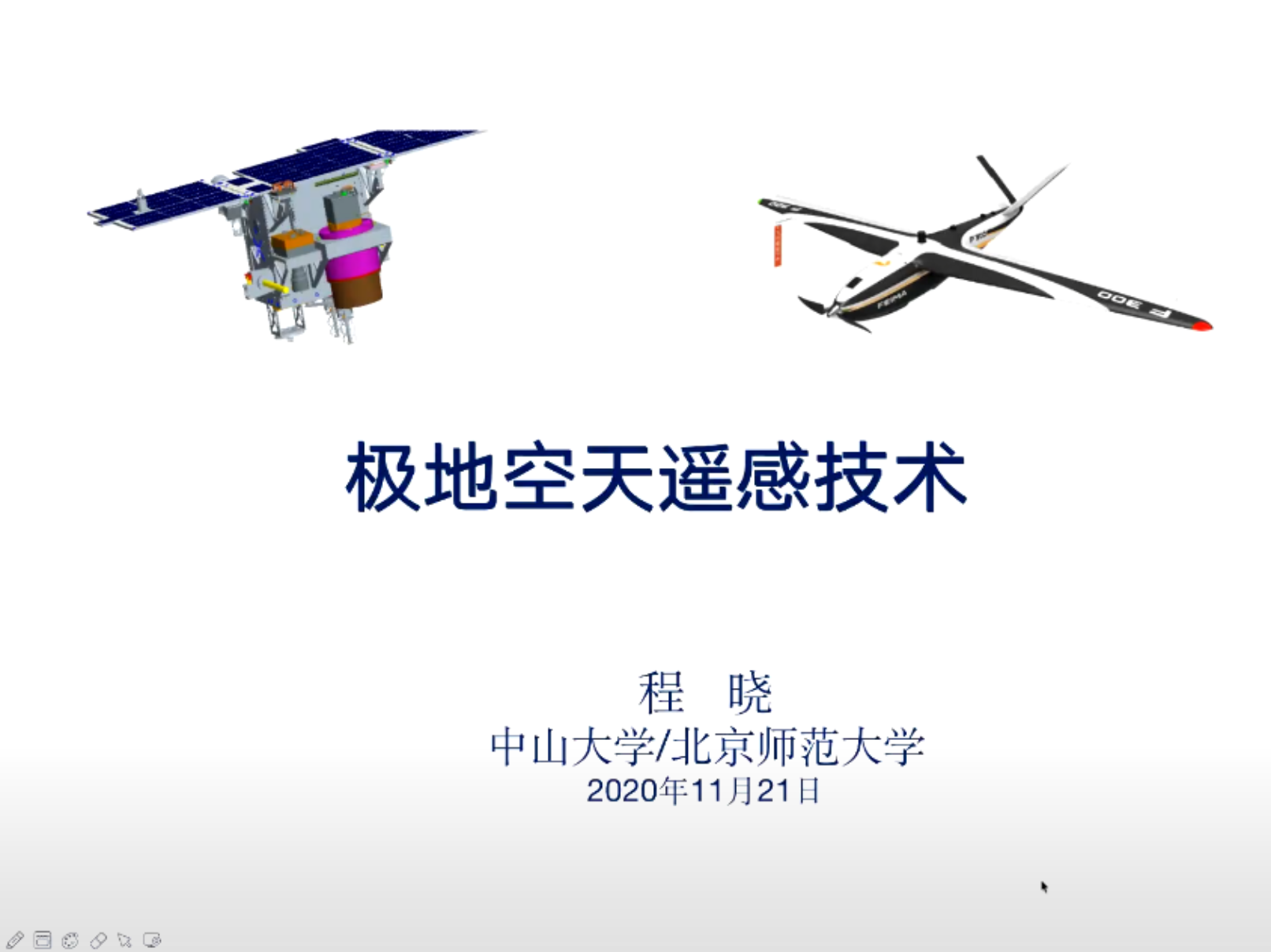 程晓教授作了题为“极地空天遥感技术”的主题报告。报告从极地在国家战略中的重要地位讲起,论述了遥感在南北极研究中的重要作用。然后,程晓教授回顾了目前国内外民用遥感卫星在极地研究中的应用,指出我国遥感卫星在极地研究中有定量化、连续性两大短板,国产卫星当自强,实现业务化连续观测对科研才真正有意义。最后,程晓教授汇报了其在极地航空遥感系统建设中的工作,针对极地的极端环境,研制了“极鹰”系列四代遥感无人机系统。