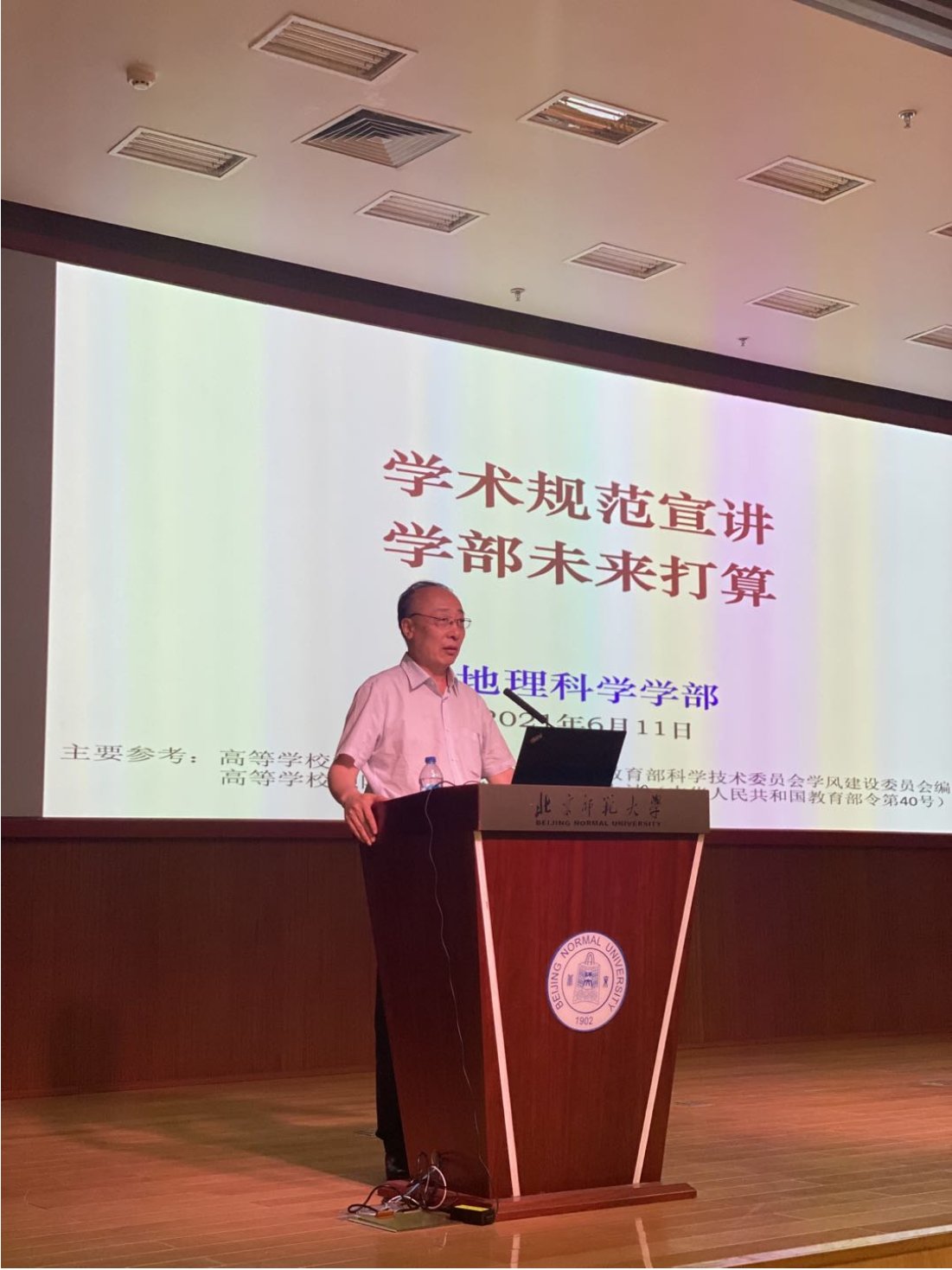 大会第三项,由宋长青部长进行学术规范宣讲并介绍了学部的未来规划。宋部长详细说明了学术不端行为的概念界定及表现形式,特别强调科研活动中容易出现的问题,对于存在和出现的问题,希望广大教师引以为戒,高度重视学术规范建设。接下来,宋部长从地理学科发展的视角介绍了学部的未来发展规划,重点通报了学部即将在人事制度改革、绩效评价体系改革、教学团队建设、珠海校区布局等方面开展的工作举措。