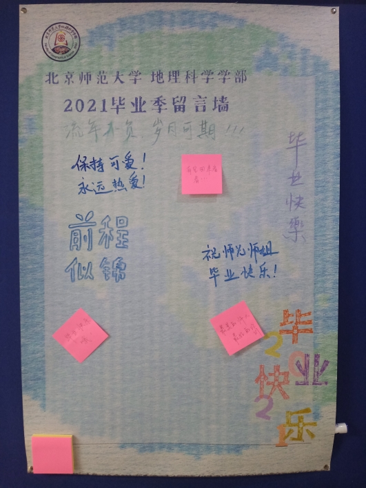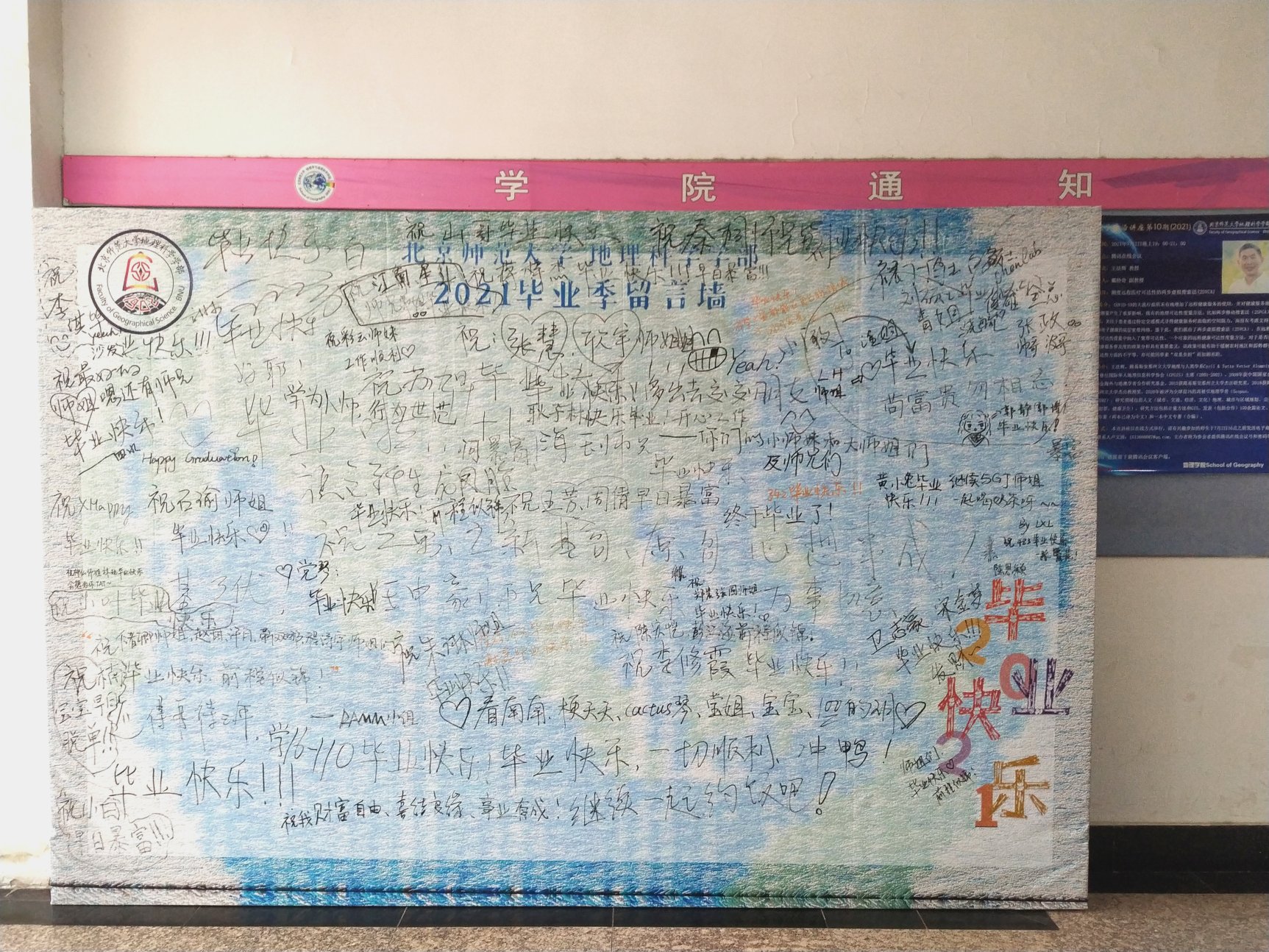 (4)6月24日,2021毕业季留言墙、合影墙部署完毕,向师生开放。留言墙分别布置在生地楼一楼大厅以及京师科技大厦8层、10层、12层,合影墙位于敬文讲堂南侧,自开放以来累计记录留言和签名100余条,师生纷纷前往合影留言,留下毕业记忆。
