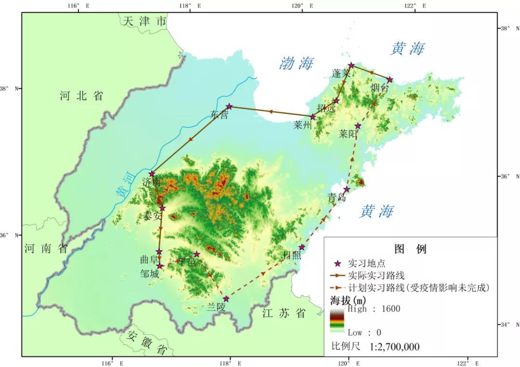 本次实习以“海岱儒风行·百年新征程”为主题,原计划时长12天,从鲁东大学所在地烟台出发,途径蓬莱、莱州、东营、济南、泰安、曲阜、兰陵、五莲、莱阳,最后回到烟台,形成环绕山东半岛的闭环,过程中分别由鲁东大学、山东师范大学、泰山学院、曲阜师范大学、临沂大学负责讲解和接待。但是,因受疫情影响,8月3日提前在孔子故里曲阜结束了实习。虽有遗憾,但实习已涵盖了山东海岸海洋地理、泰山自然与人文地理、儒家思想内涵与传承等经典内容,师生均收获颇丰。
